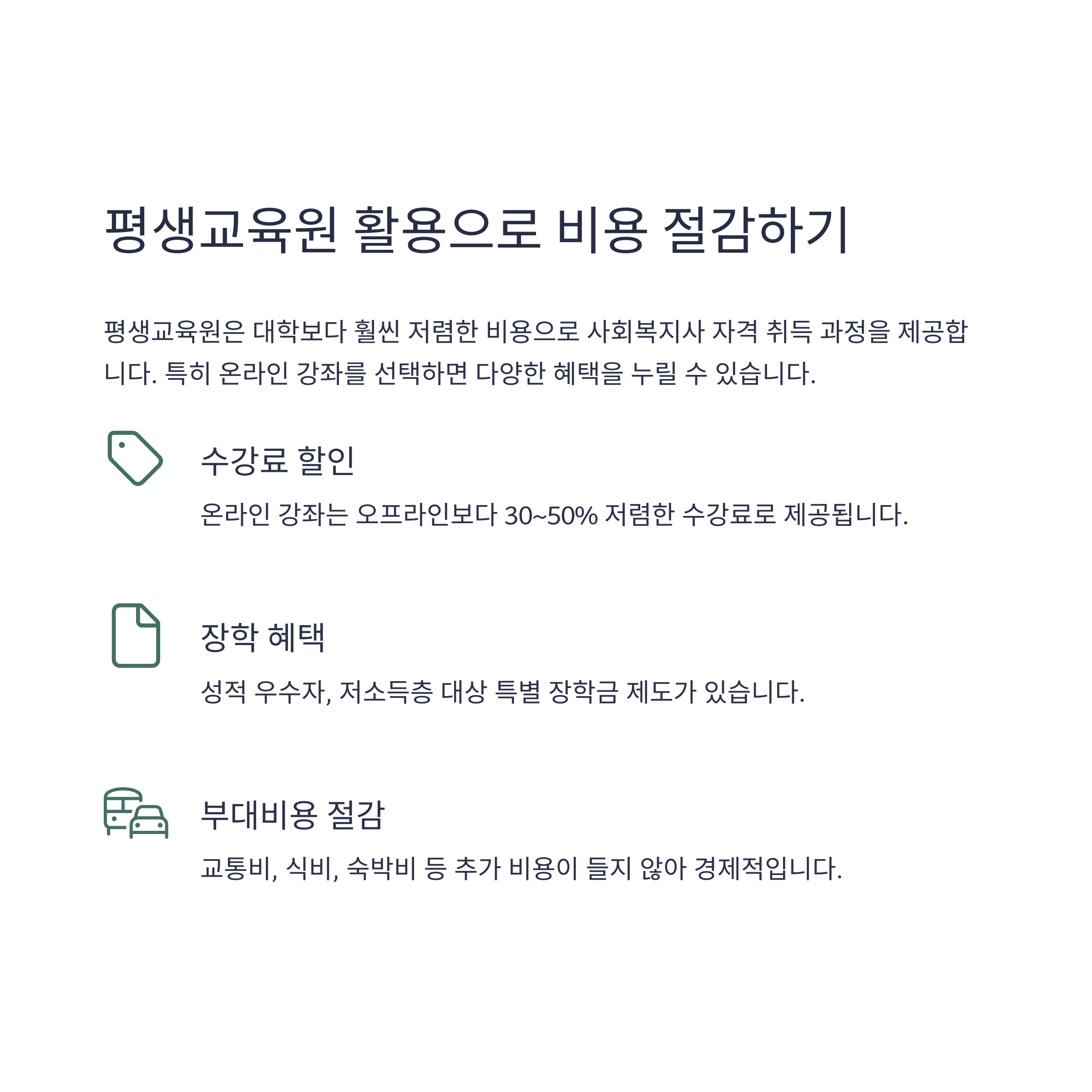 평생교육원은 대학보다 훨씬 저렴한 비용으로 강의를 들을 수 있어 인기입니다 온라인 강좌를 수강할 경우 수강료 할인이나 장학 혜택이 많아 전체 교육비가 상당히 저렴해집니다 특히 온라인 수업은 별도의 교통비나 숙박비가 들지 않기 때문에 경제적인 이점이 큽니다