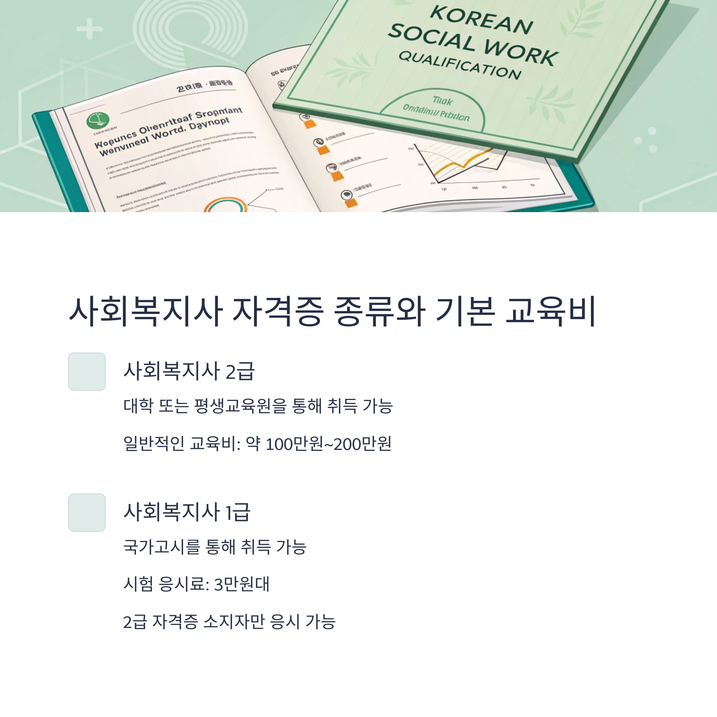 사회복지사 자격증은 크게 1급과 2급으로 나뉩니다 2급 자격증의 경우 대학 또는 평생교육원을 통해 취득할 수 있으며 일반적으로 약 100만원에서 200만원 정도 비용이 듭니다 1급은 국가고시를 통해 취득할 수 있으며 응시료는 보통 3만원대입니다