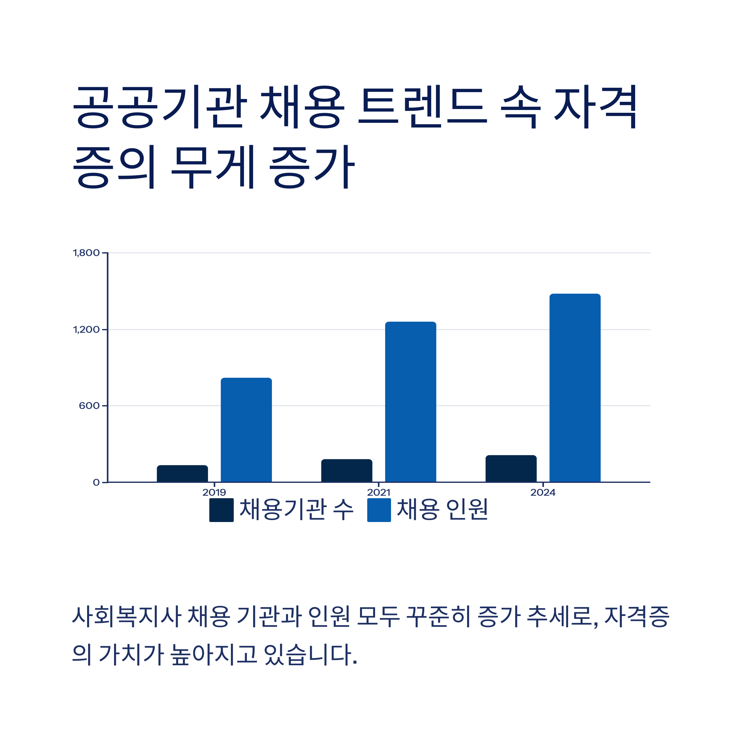 위 표에서 보듯, 사회복지사를 채용하는 기관 수와 인원 모두 지속적으로 증가하고 있습니다.