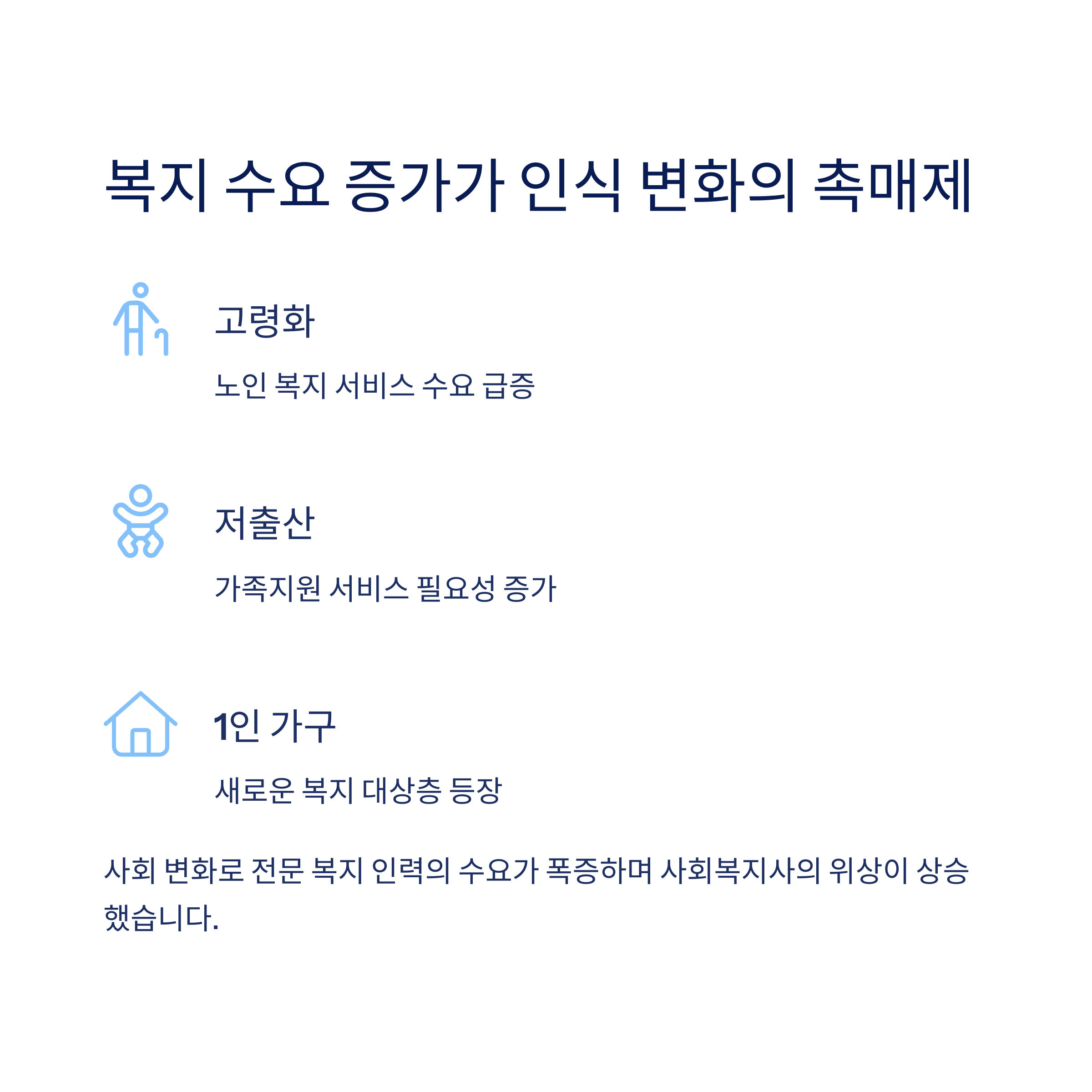 고령화, 저출산, 1인 가구 증가 등 다양한 사회 변화가 복지 수요를 폭증시켰습니다.