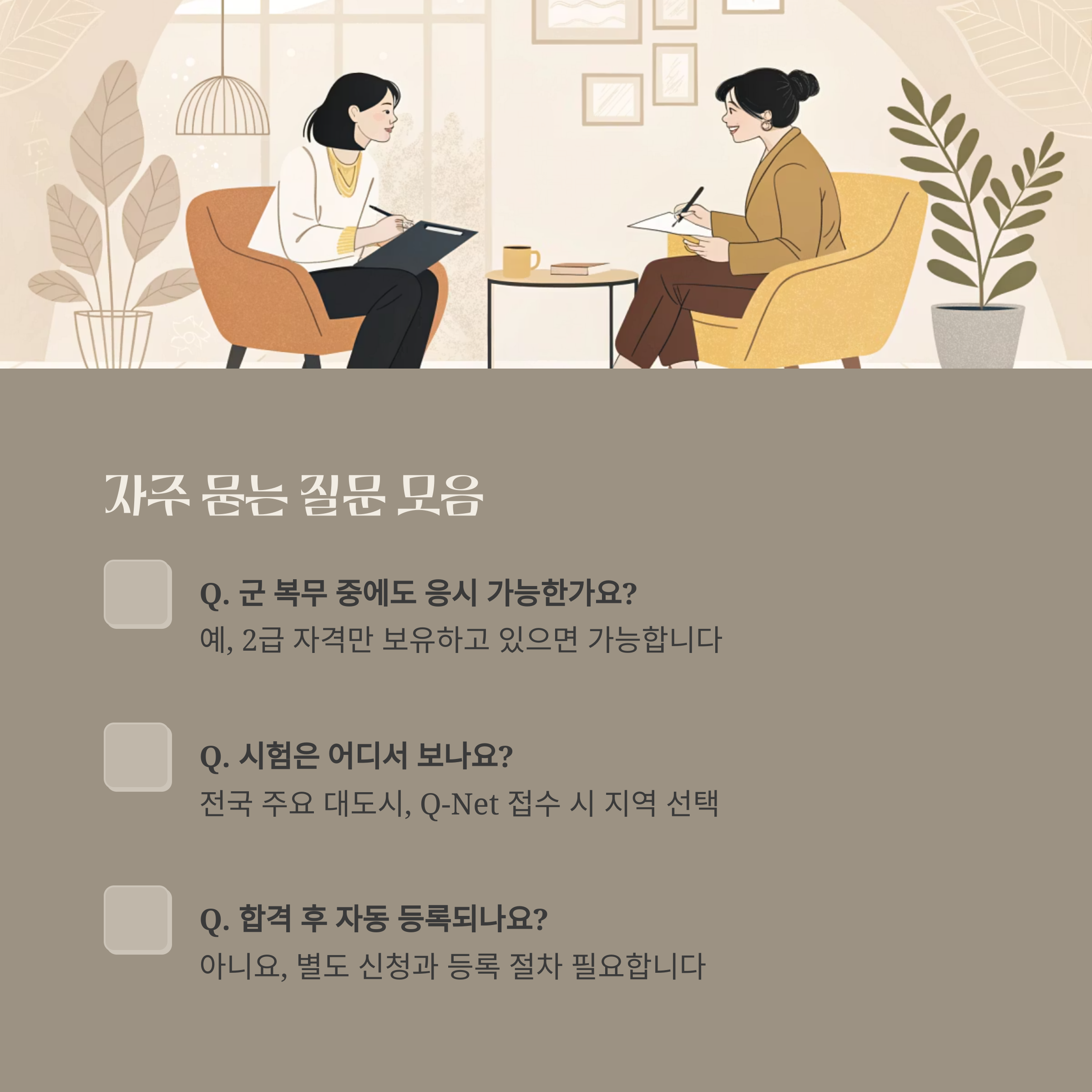 | Q. 군 복무 중에도 응시 가능한가요? | 예, 2급 자격만 보유하고 있으면 가능합니다 |