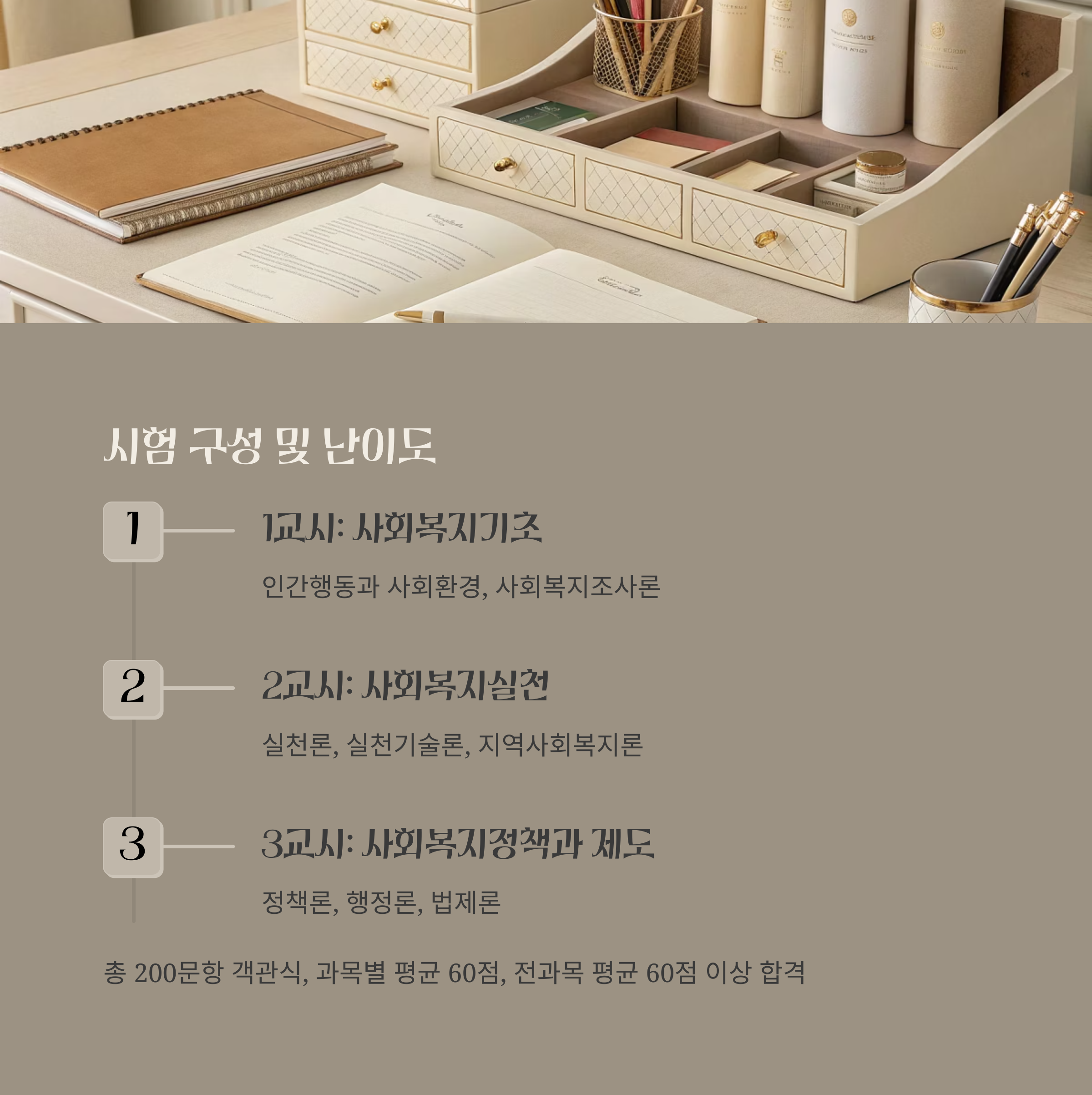 사회복지사 1급 시험은 총 3교시, 3과목으로 나뉘며, 과목별로 세부 영역이 포함되어 있습니다.