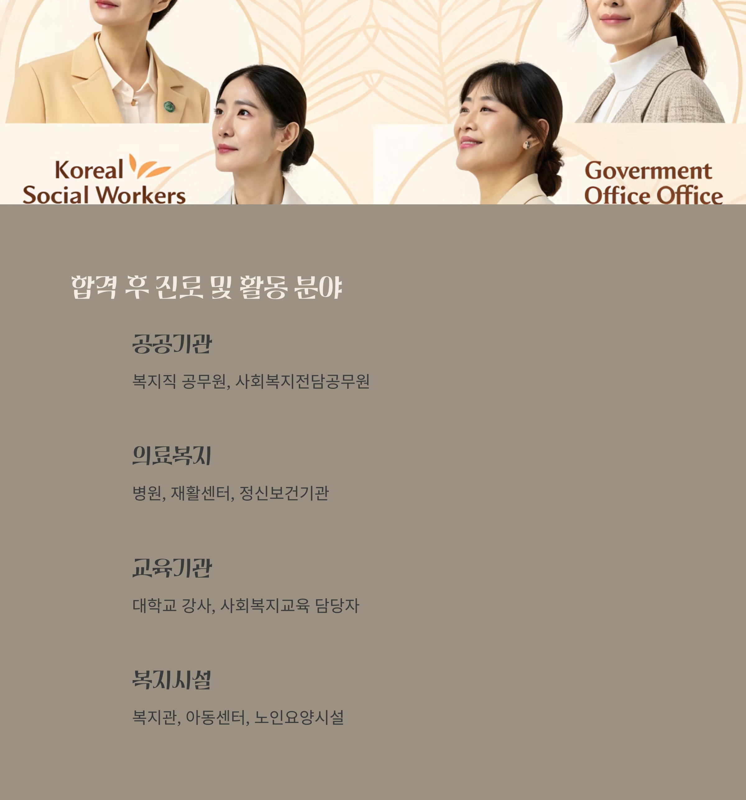 - 공공기관: 지자체 복지직 공무원, 사회복지전담공무원