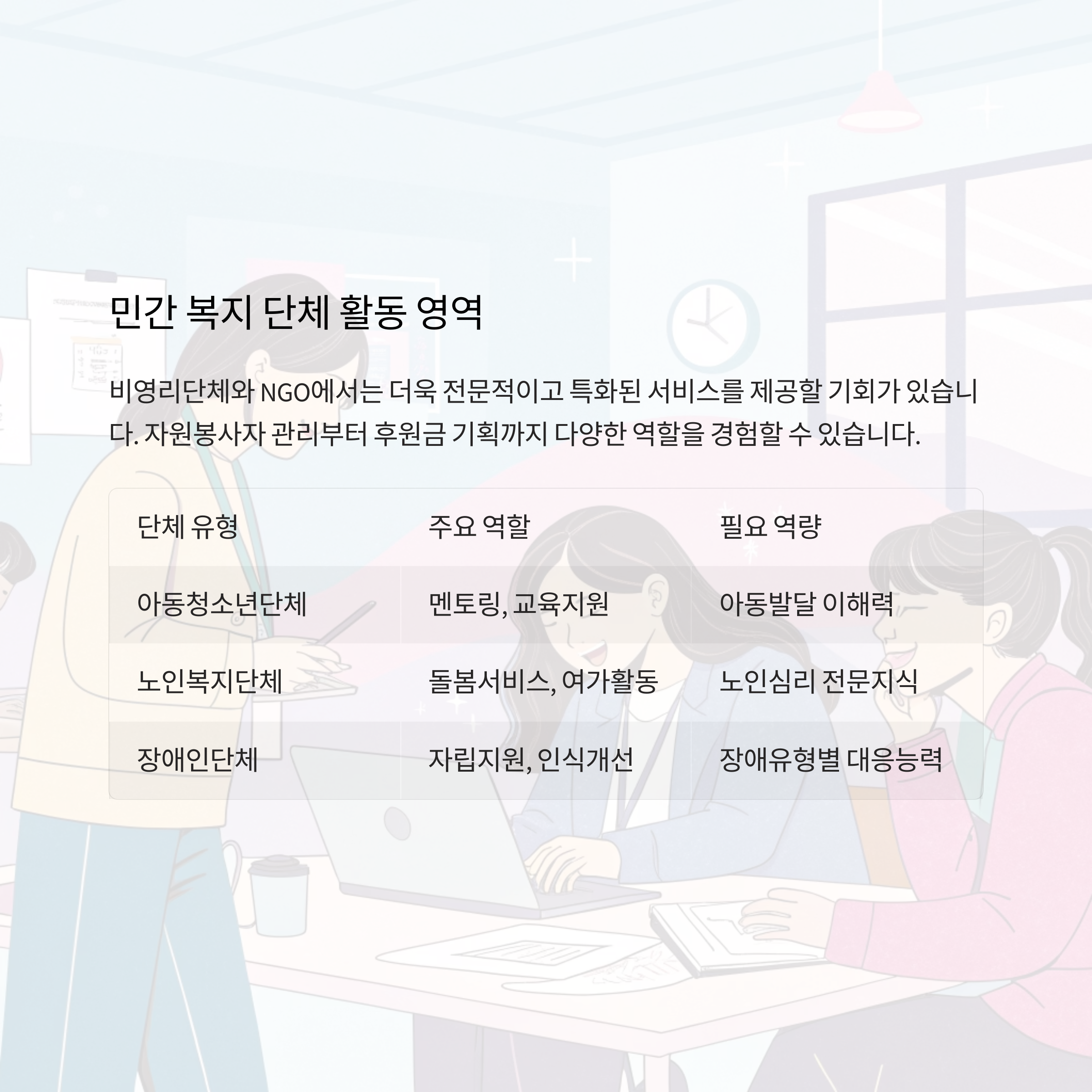 다양한 업무를 접하실 수 있습니다. 아래 표는 대표 단체와
