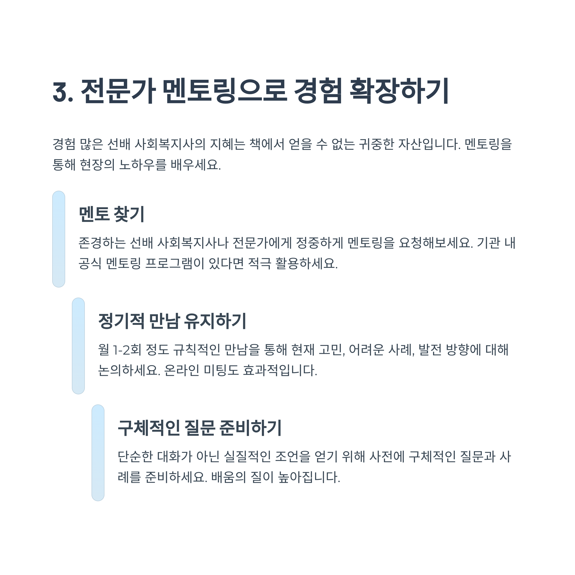 정기적으로 멘토와 만남을 설정하고 사례를 공유하며 질문을 던져 보세요.