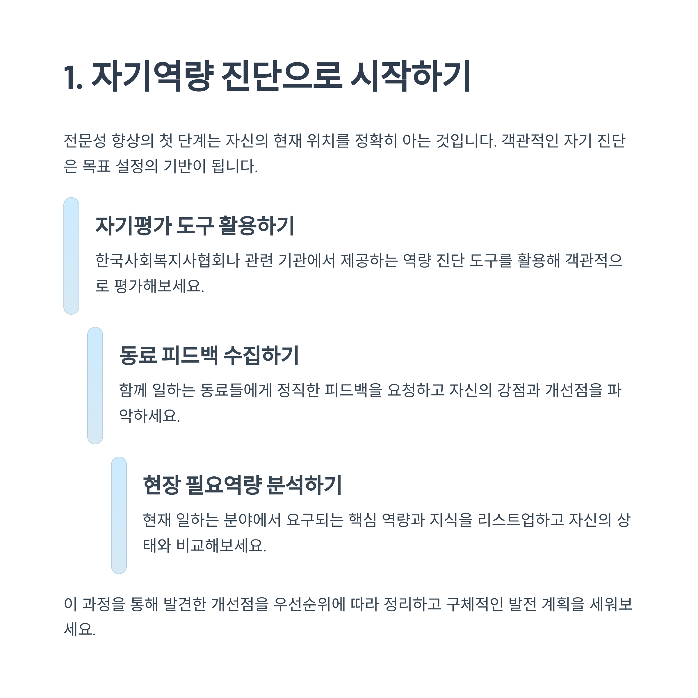 이를 위해 자기 평가 도구를 활용하거나 동료와 상호 피드백을 진행해 보세요.