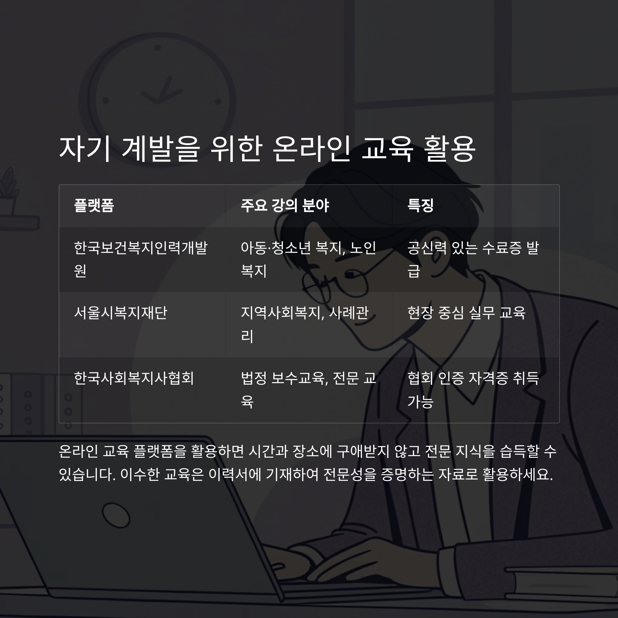 온라인 교육 플랫폼을 통해 사회복지 관련 전문 강의를 수강하면
