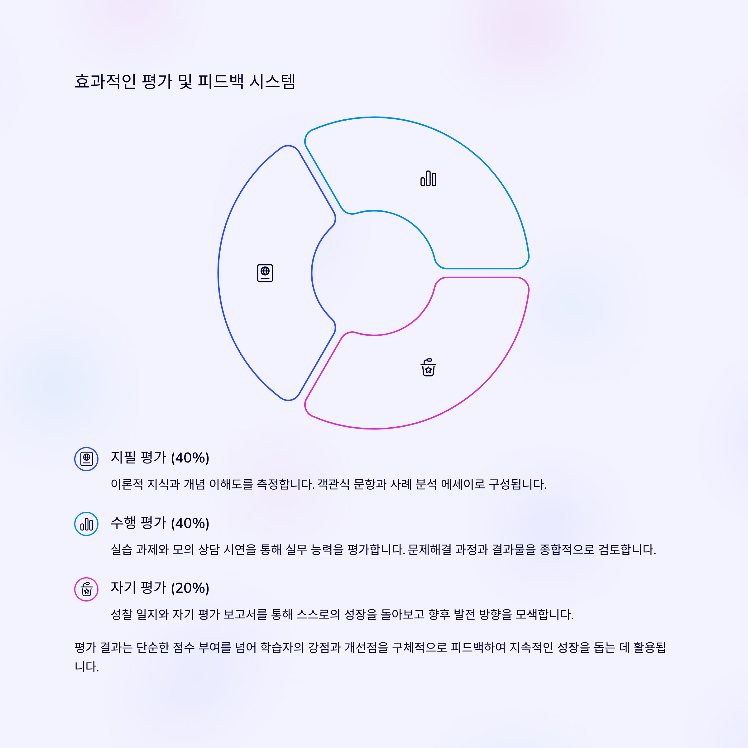 학습 성과 평가는 지필, 수행, 자기 평가로 다각화합니다.