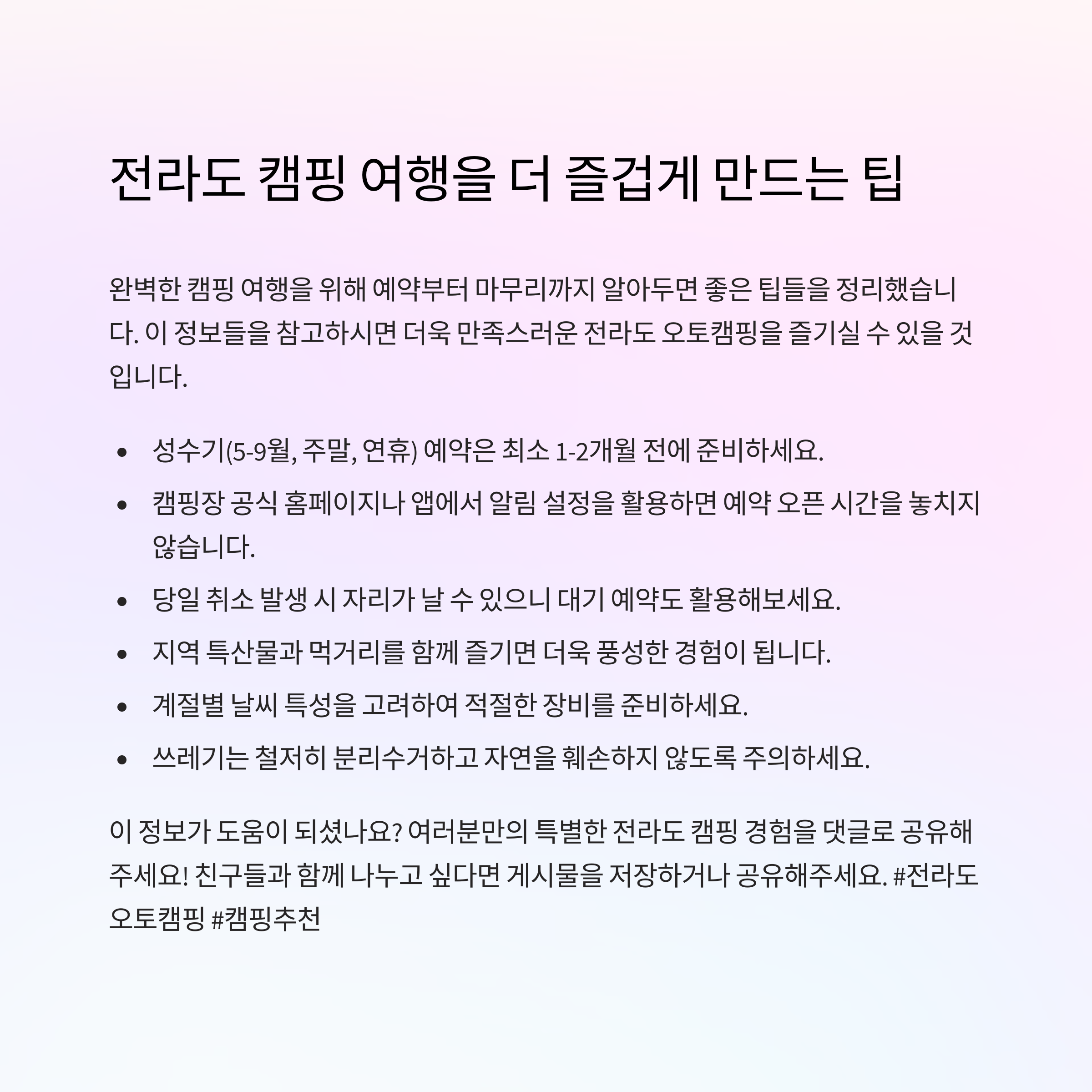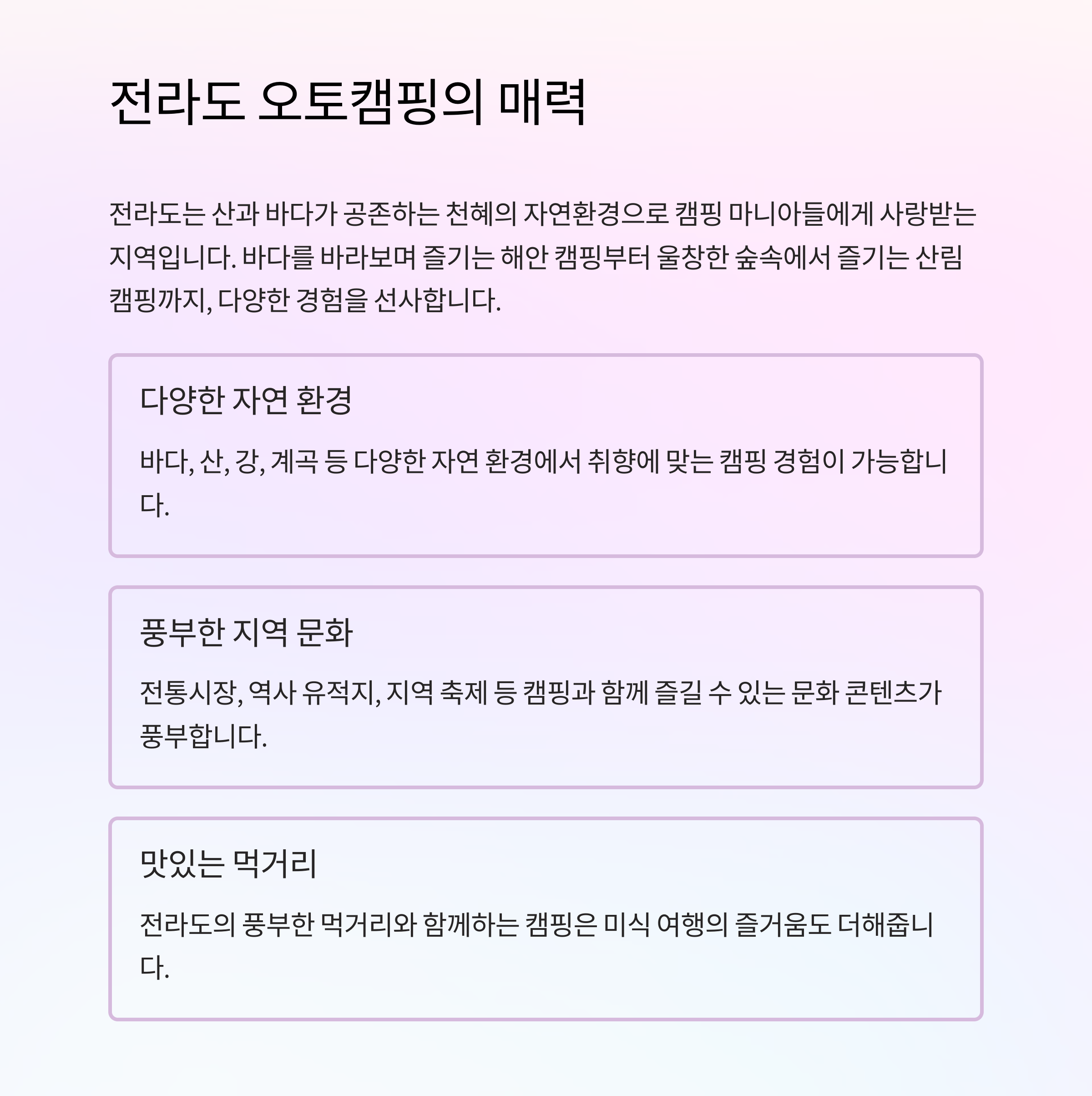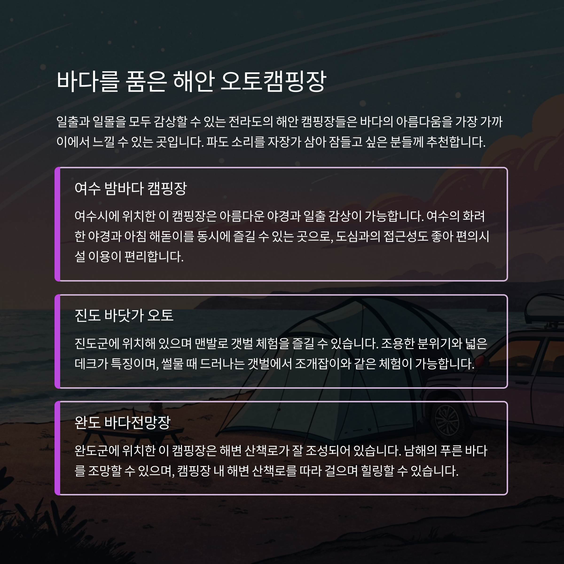 전라도 지역은 바다와 산을 동시에 품고 있어 각양각색의 오토캠핑장 선택지가 풍부합니다.