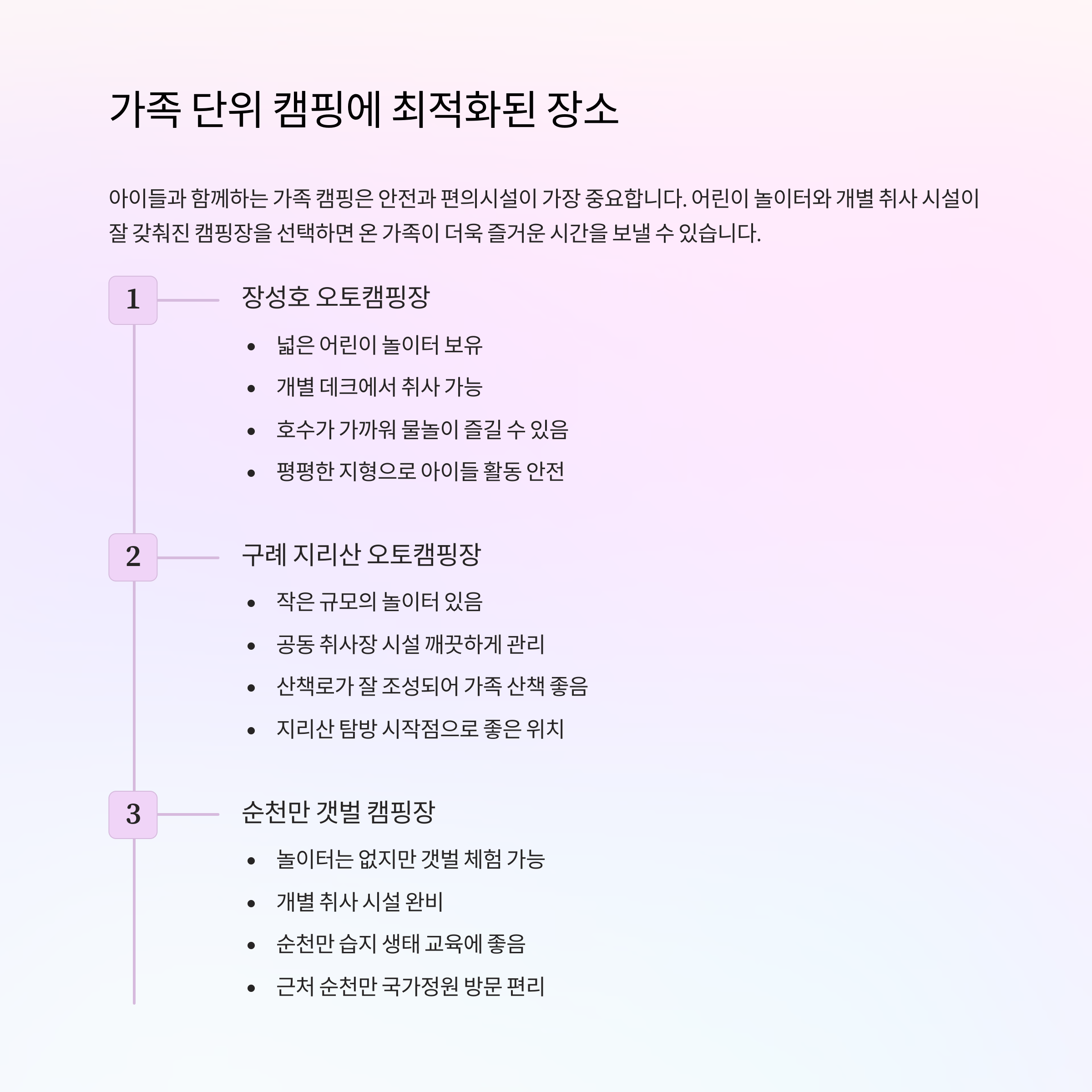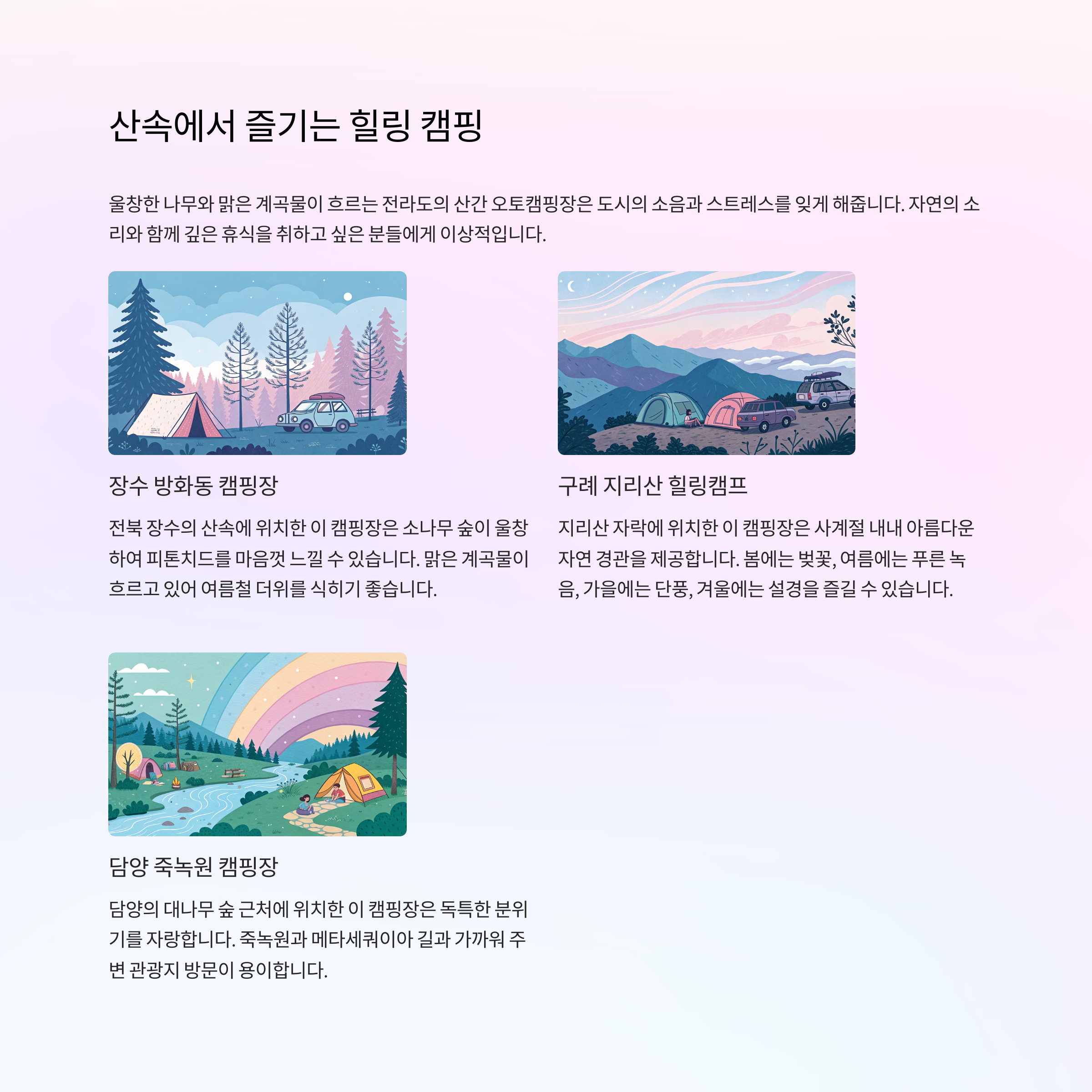 본 글에서는 해안 뷰가 뛰어난 캠핑장부터 숲속 힐링 공간, 가족 단위와 반려동물 동반에 적합한