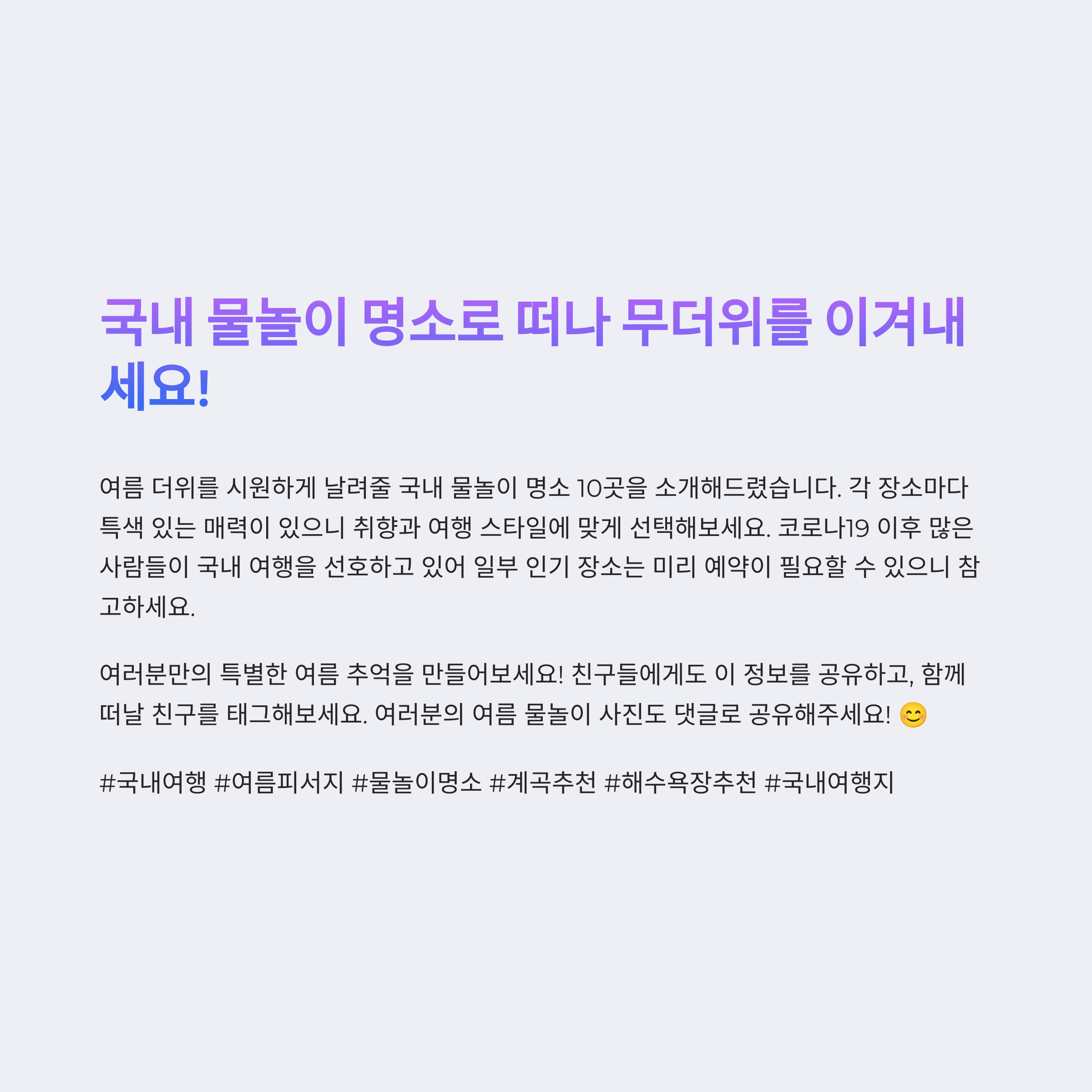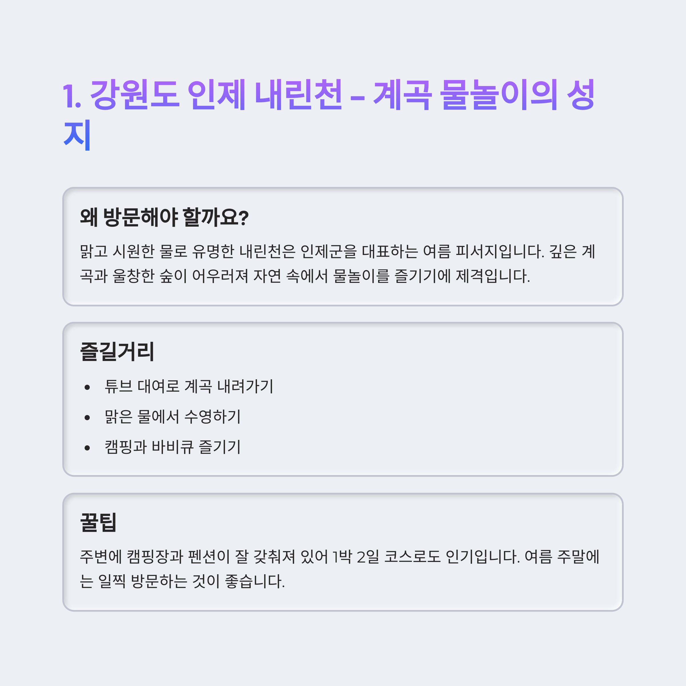 무더운 여름, 멀리 떠나지 않아도 시원하게 즐길 수 있는 국내 물놀이 명소를 소개합니다. 계곡부터 바다, 워터파크까지 남녀노소 모두가 즐길 수 있는 인기 장소들을 정리했으며, 각 명소별 특징과 꿀팁도 함께 안내드립니다. 여행 계획을 세우는 분들께 실질적인 도움이 되실 거예요.