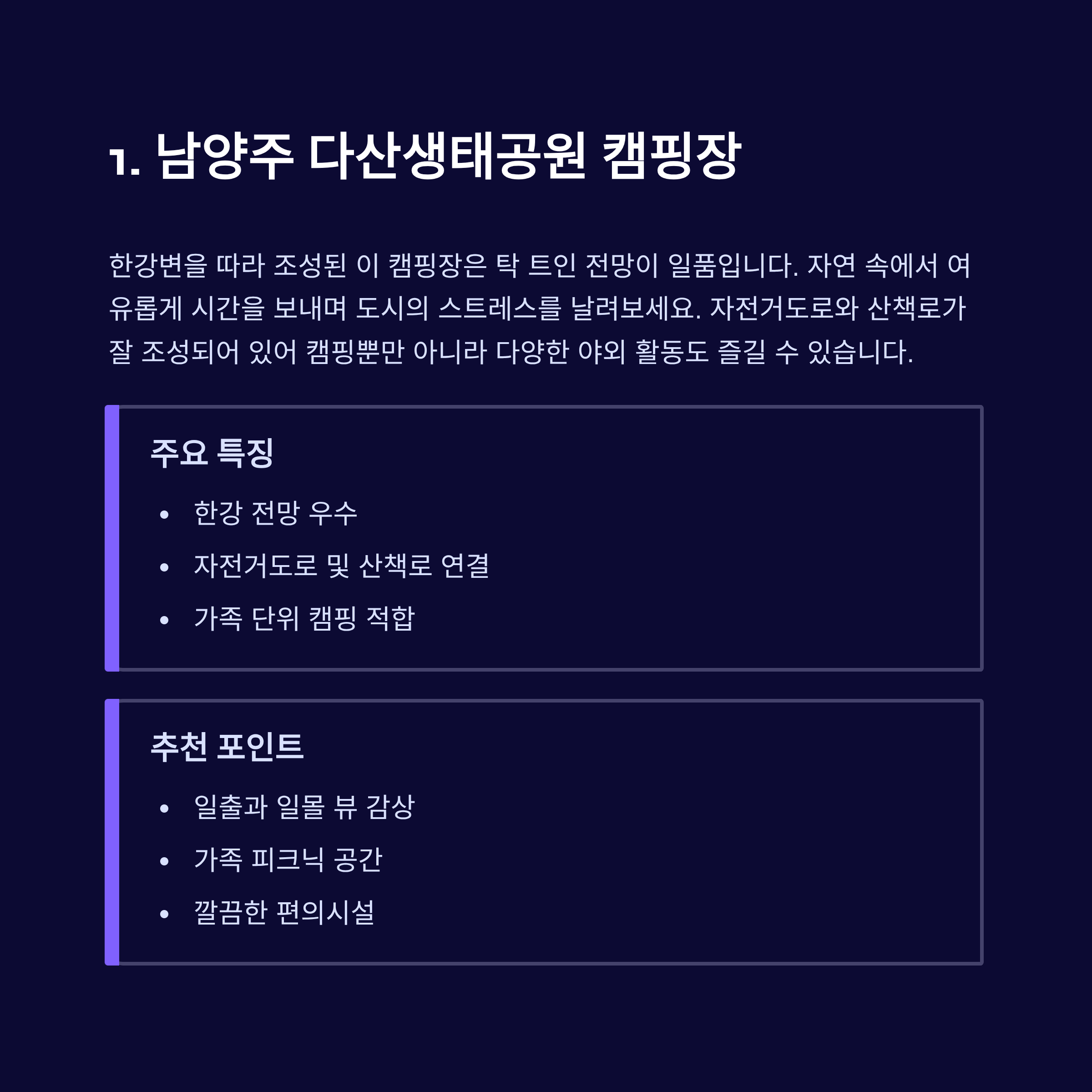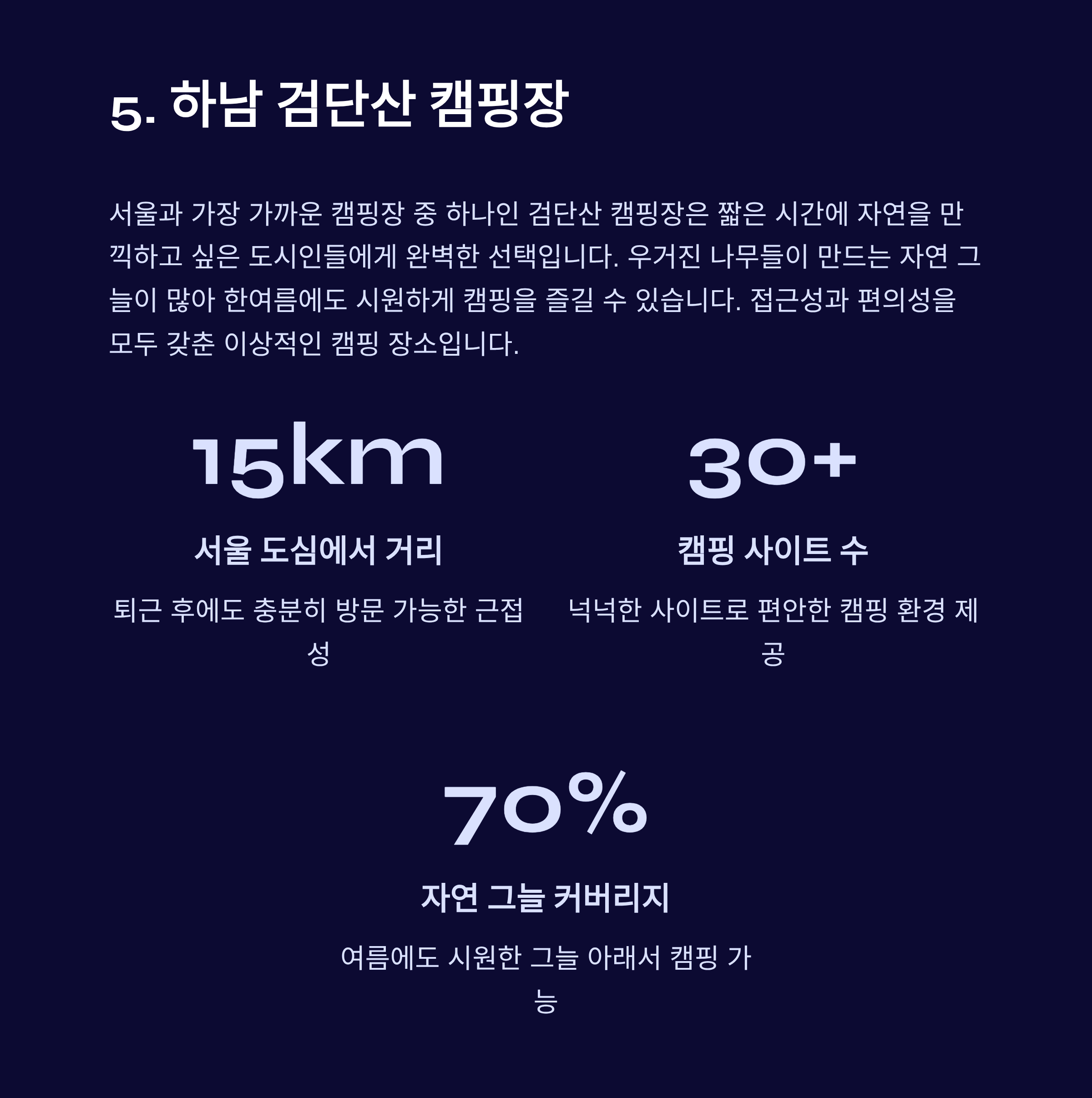 | 검단산 캠핑장 | 하남 | 서울 근접, 여름에도 시원함 |