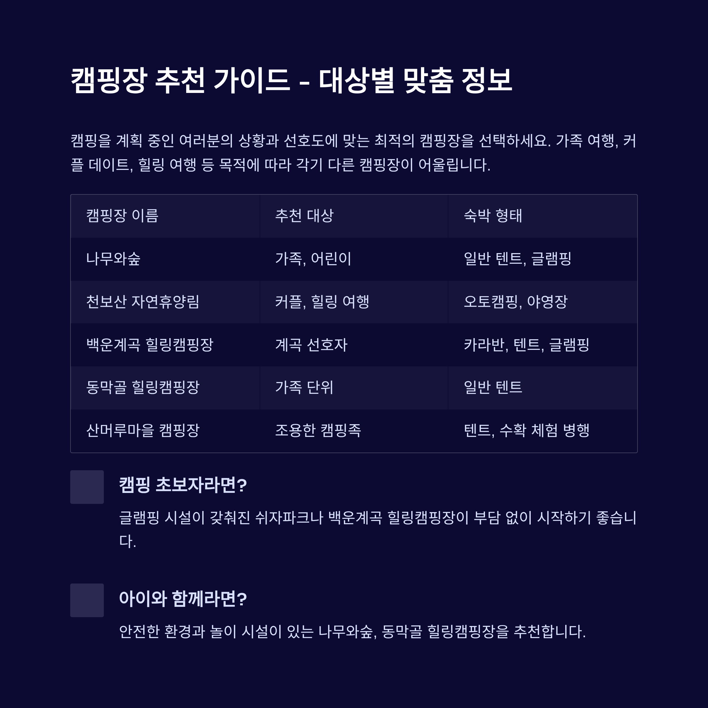 캠핑장 이름 추천 대상 숙박 형태