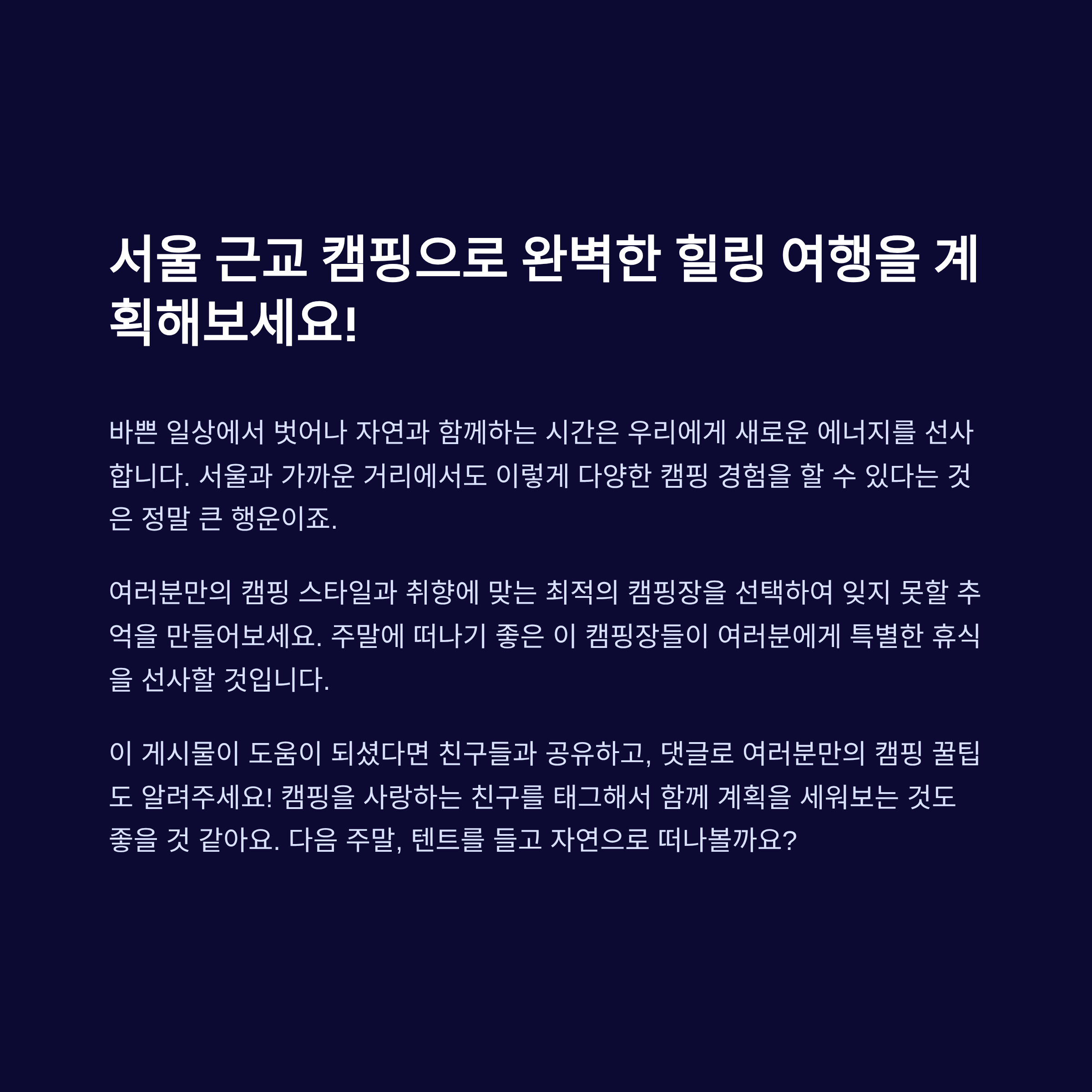 서울과 가까우면서도 자연을 온전히 느낄 수 있는 서울 근교 캠핑장은 주말 힐링 여행으로 제격입니다. 접근성, 편의시설, 경치, 가족 단위나 커플에게 맞춤형 캠핑장까지 다양하게 소개합니다. 도심 속 일상을 잠시 벗어나 텐트를 치고 별을 보는 여행을 계획하고 있다면, 이 10곳을 주목해보세요.