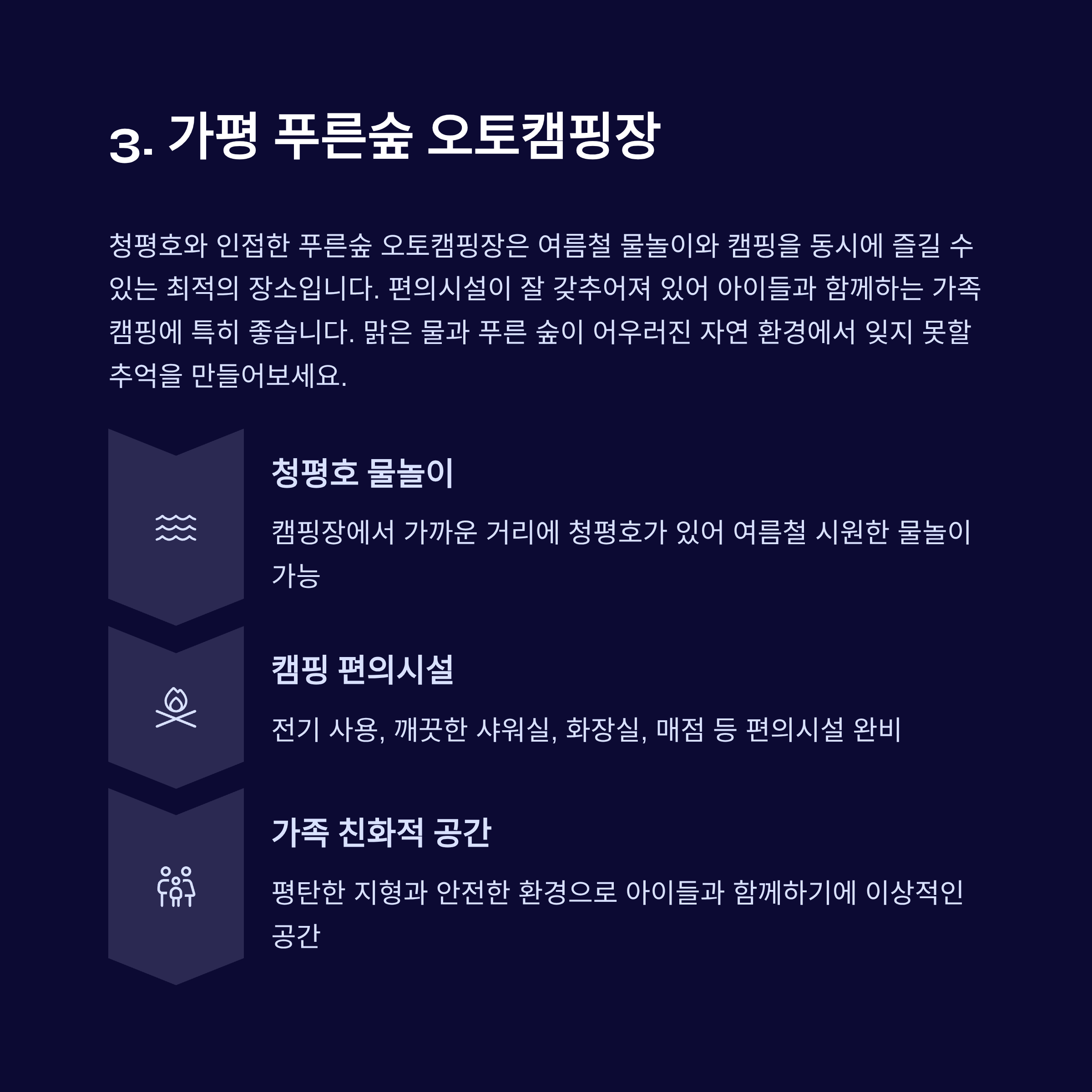 | 푸른숲 오토캠핑장 | 가평 | 청평호 인접, 물놀이 가능 |
