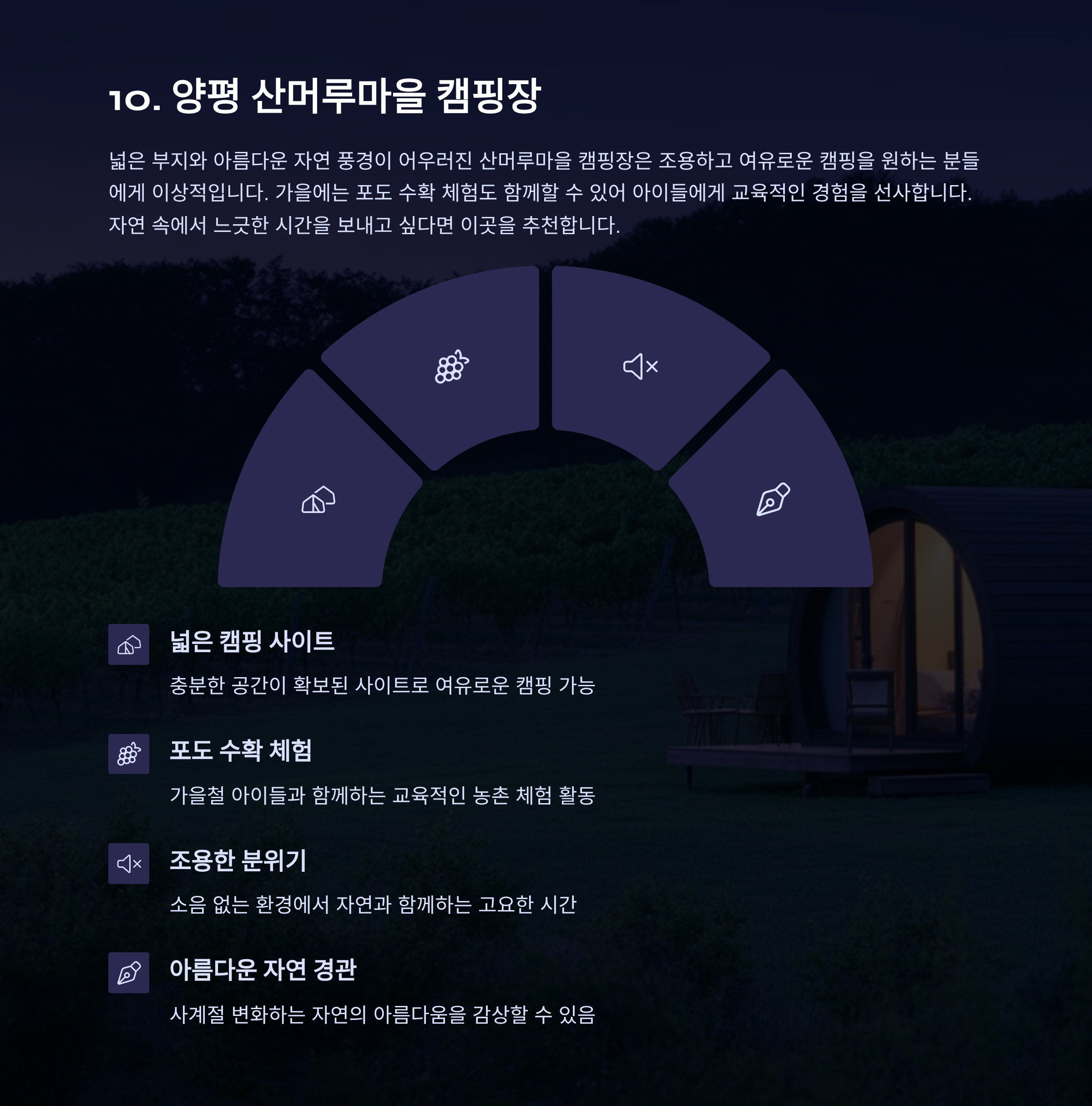 | 산머루마을 캠핑장 | 조용한 캠핑족 | 텐트, 수확 체험 병행 |