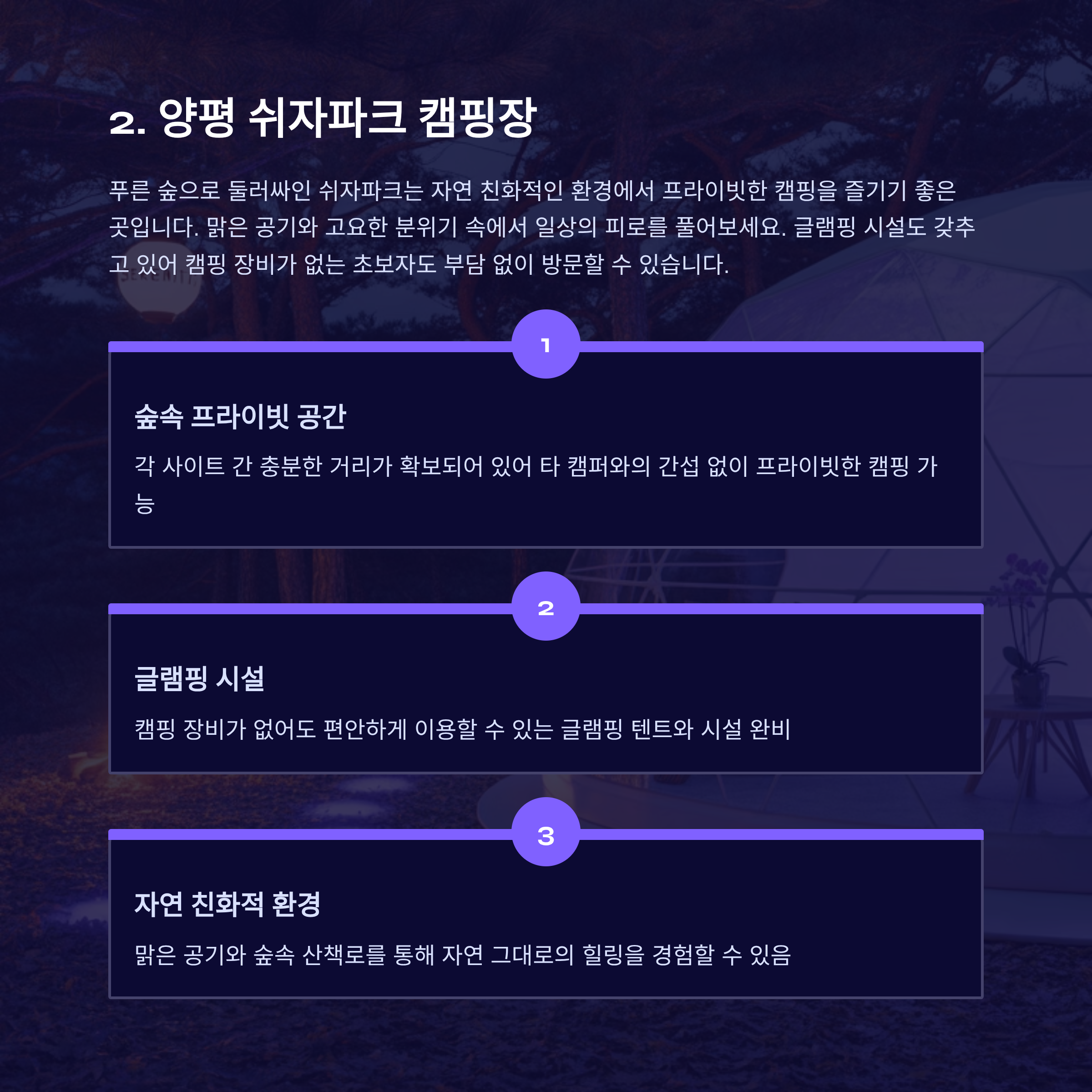 숲속에 자리 잡은 자연 친화형 캠핑장으로,