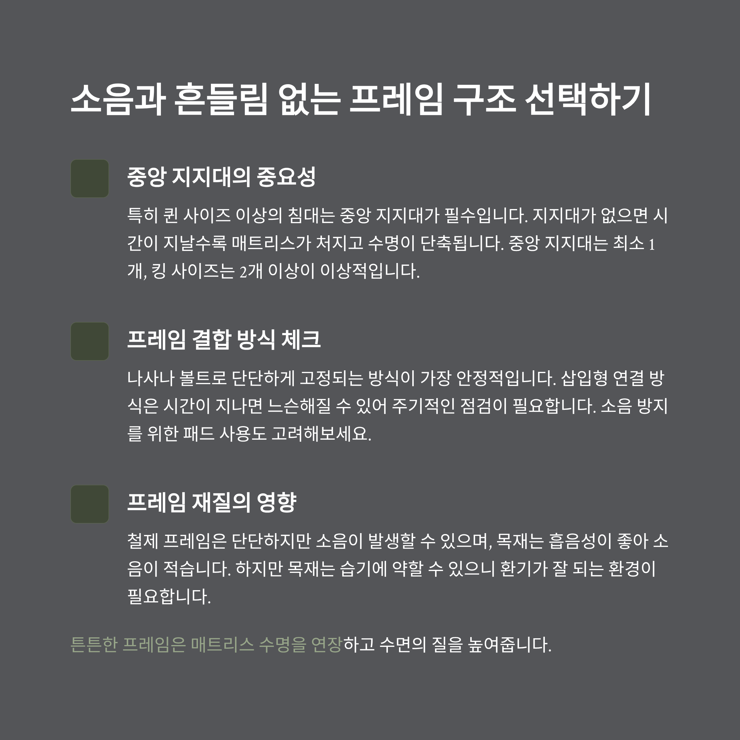 프레임이 흔들리거나 삐걱대면 매트리스 성능도 떨어지게 됩니다.