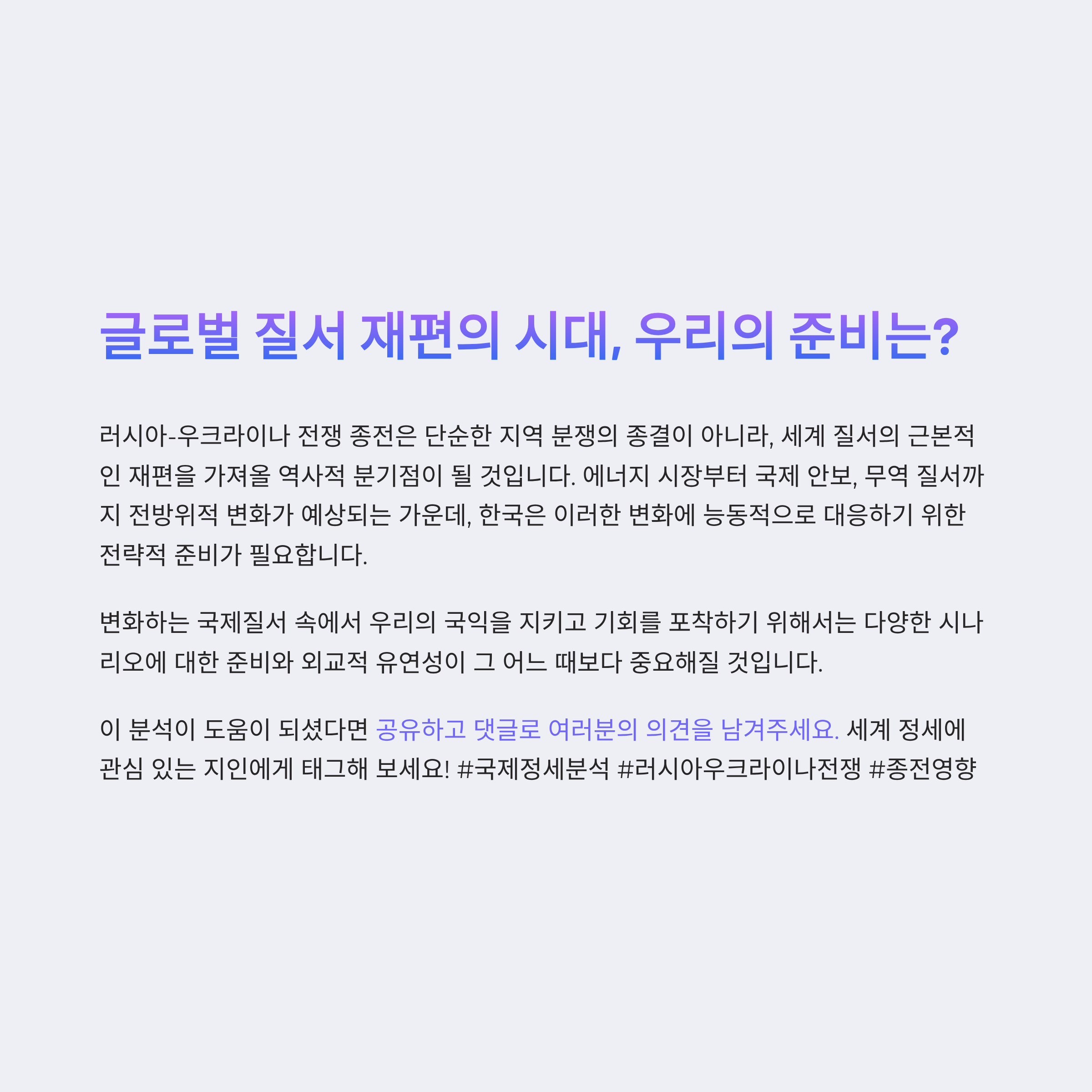 러시아와 우크라이나 전쟁의 종전은 단순한 지역 분쟁의 끝이 아니라,