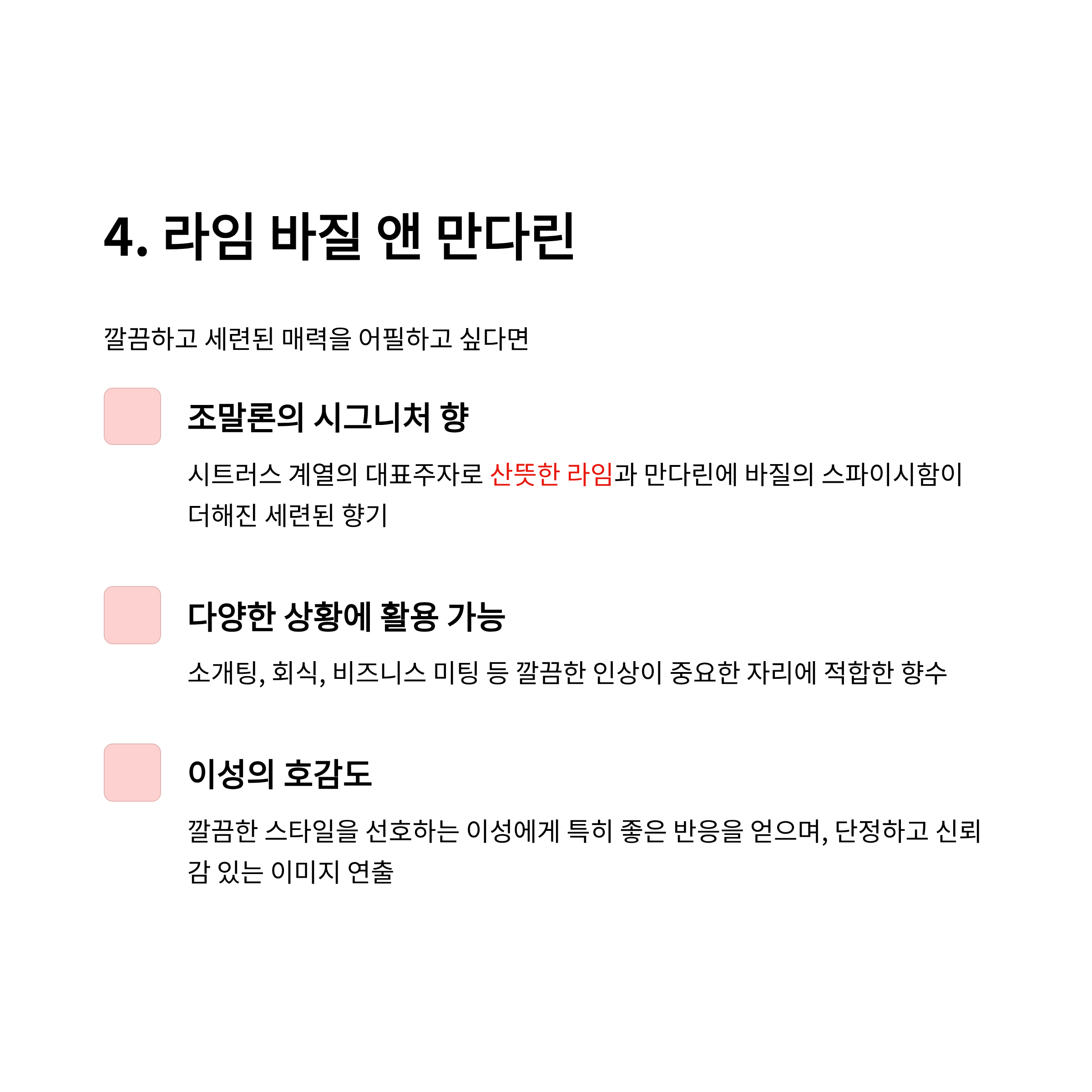 산뜻하면서도 약간의 스파이시함이 어우러져 세련된 이미지를 줍니다.