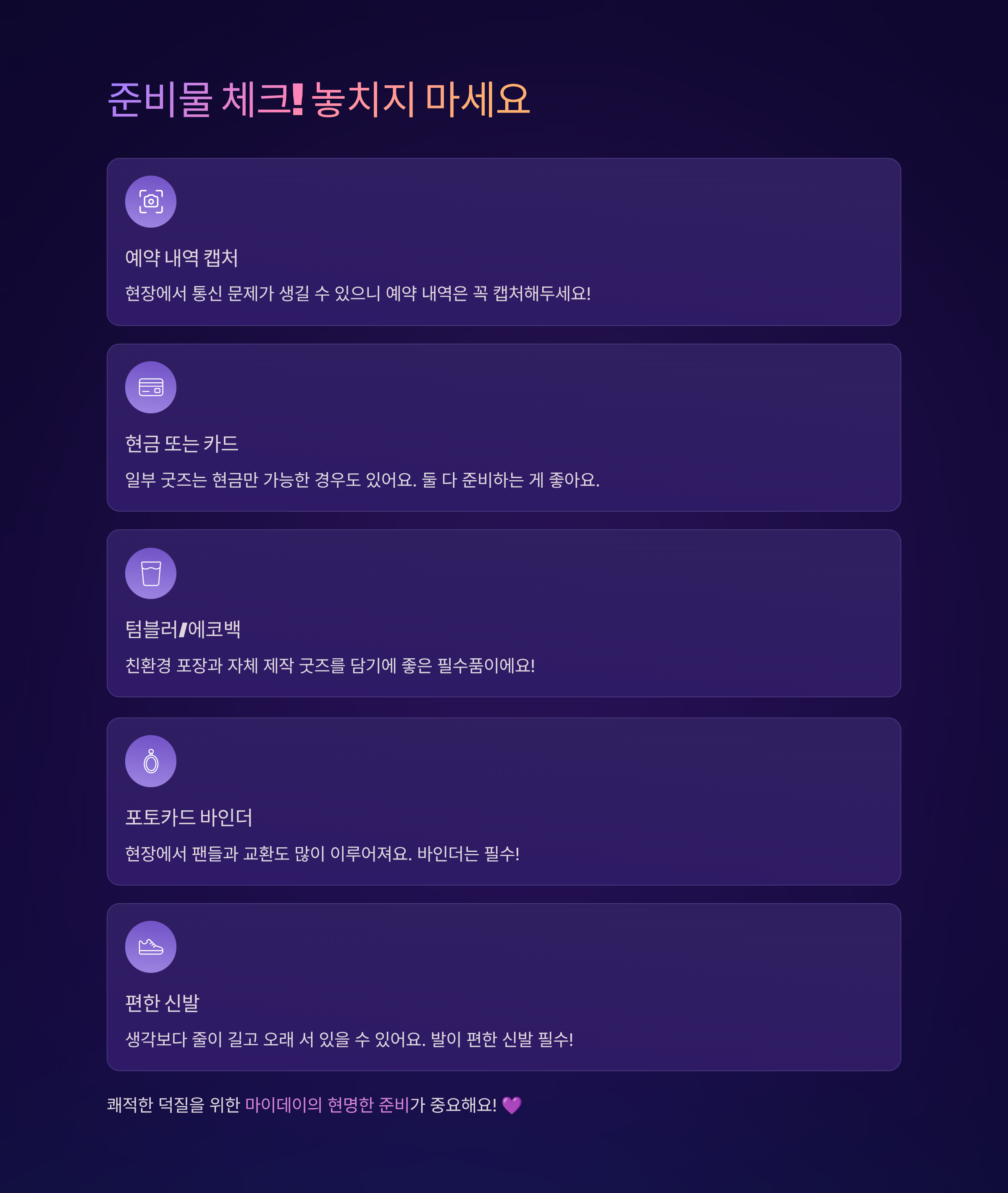 - 현금 또는 카드: 일부 굿즈는 현금만 가능할 수 있어요