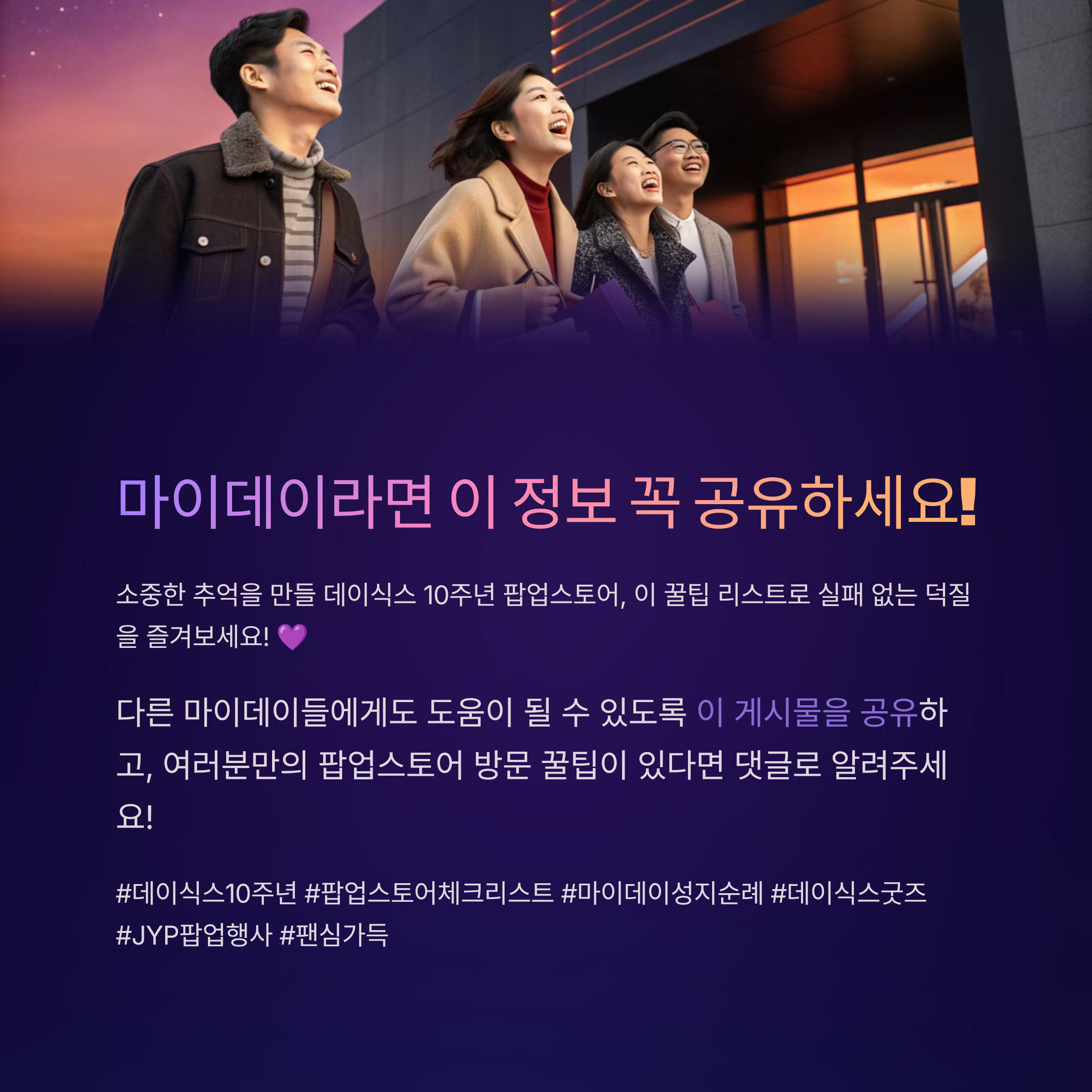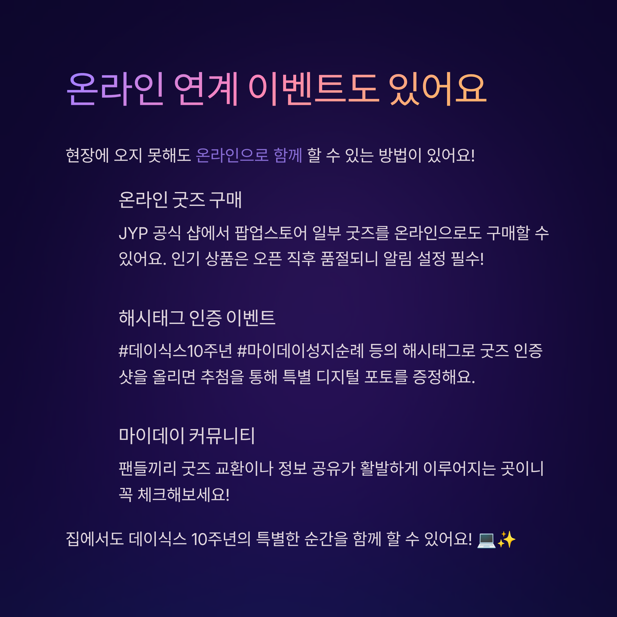 JYP 공식 샵이나 마이데이 커뮤니티를 통해 10주년 인증샷 이벤트에 참여하면 특별한 디지털 포토가 제공되기도 하니, 집에서도 함께 즐길 수 있어요.