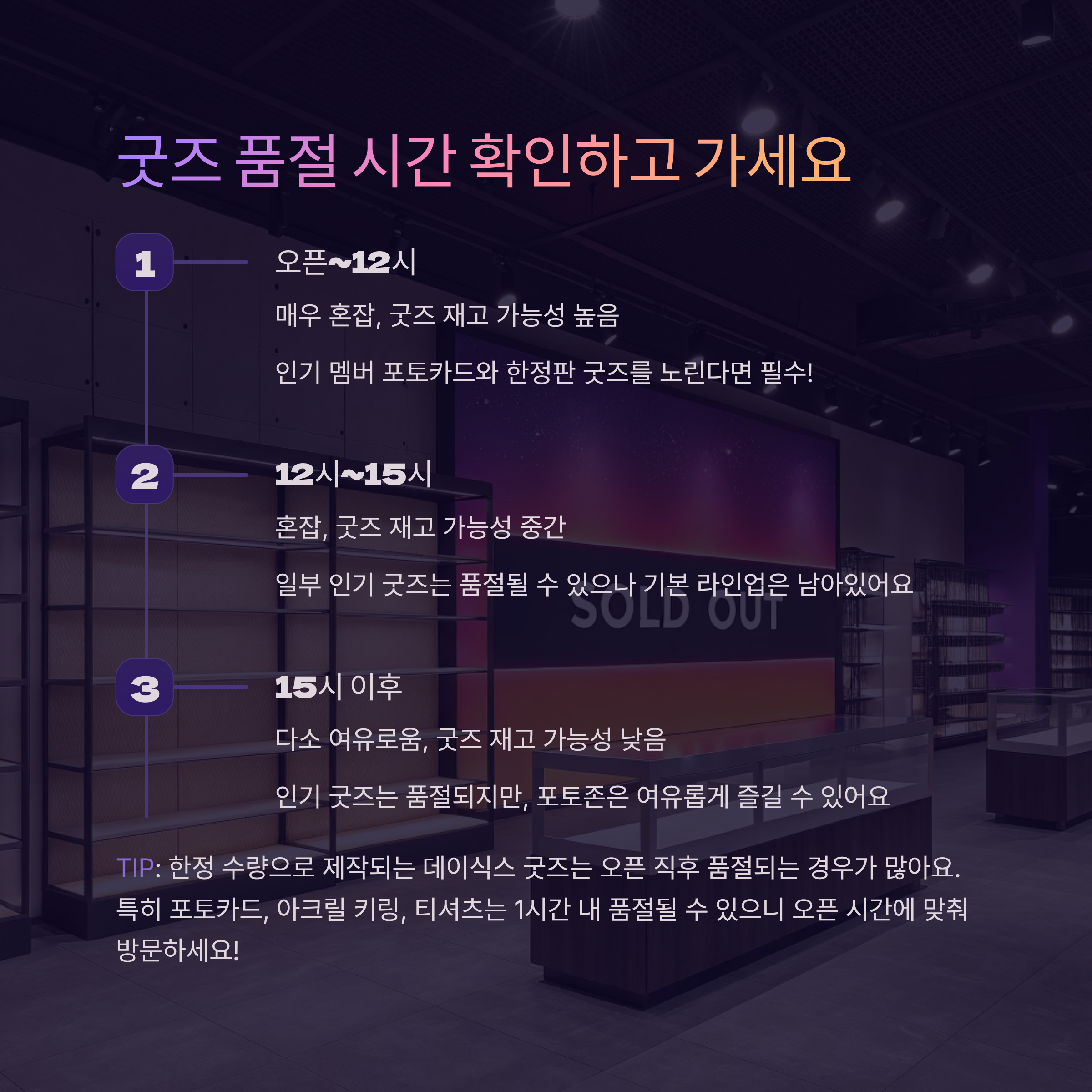시간대 혼잡도 굿즈 재고 가능성